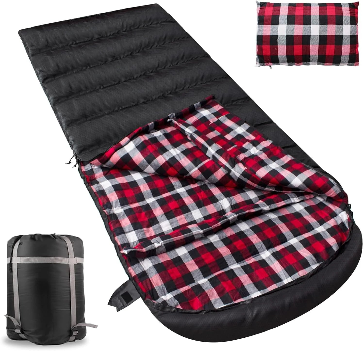 Product name: Flannel Sleeping Bag with Pillow Size:(78.74+11.81)*35.43 inch Compression bag size: 16.53*11.81*11.02 inch Pillow: 19.68*11.81inch Weight: 7Ib Color: Black & Red Outer Fabric: Spherical 210 gingham polyester tufts Inner Fabric: 100% Cotton Flannel Zipper: Resin Zipper Package Includes: 1*Sleeping Bag+1*Pillow+1*Carry bag Product Details Pillow: removable pillow cover,provides support for the head and neck to make sleep more comfortable and improve sleep quality. Pull cord on the hood: Wrap tightly around your head for added warmth. Velcro on the zipper: Prevents the zipper from accidentally opening when you flip it and keeps you warm. Bottom zipper: Allow good ventilation around your feet. Mobile phone storage bag: can store small items to prevent loss.