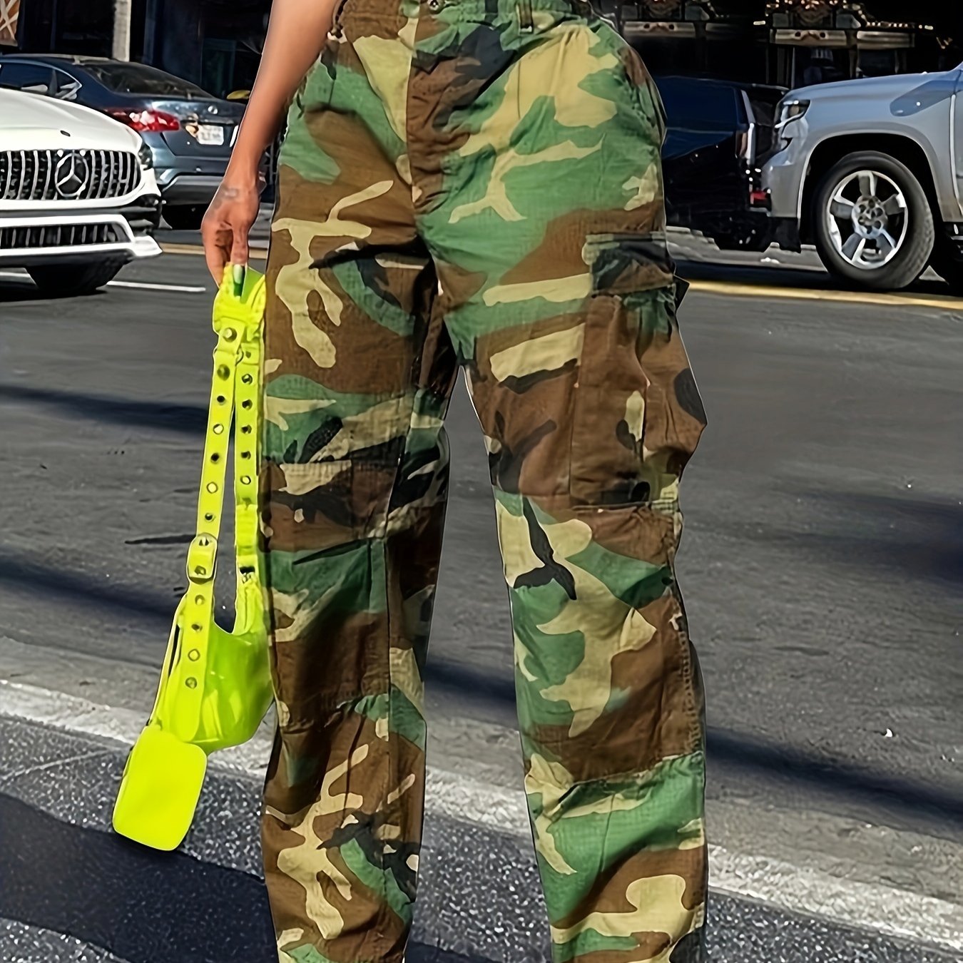 High-Waisted Women's Camo Cargo Pants, Polyester & Viscose Blend - Straight Fit, Machine Washable, with Pockets