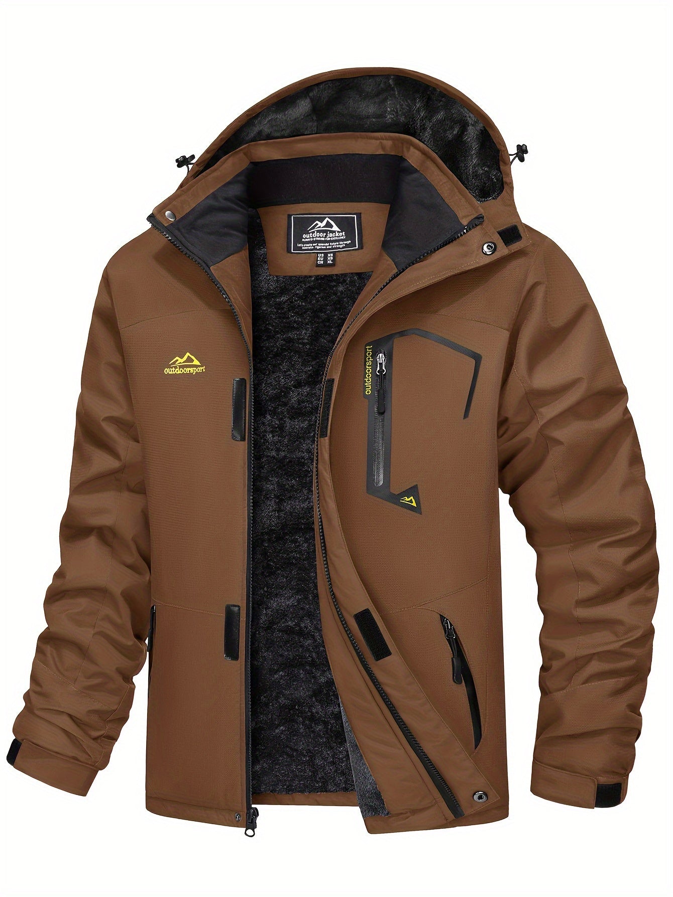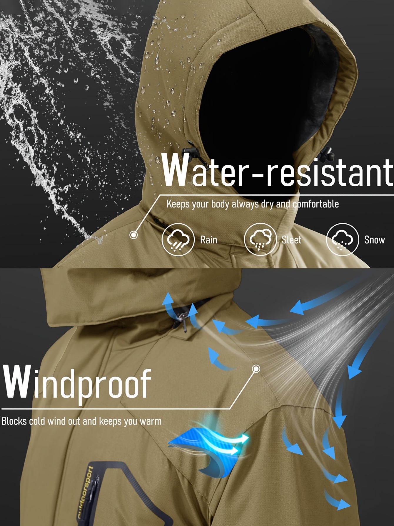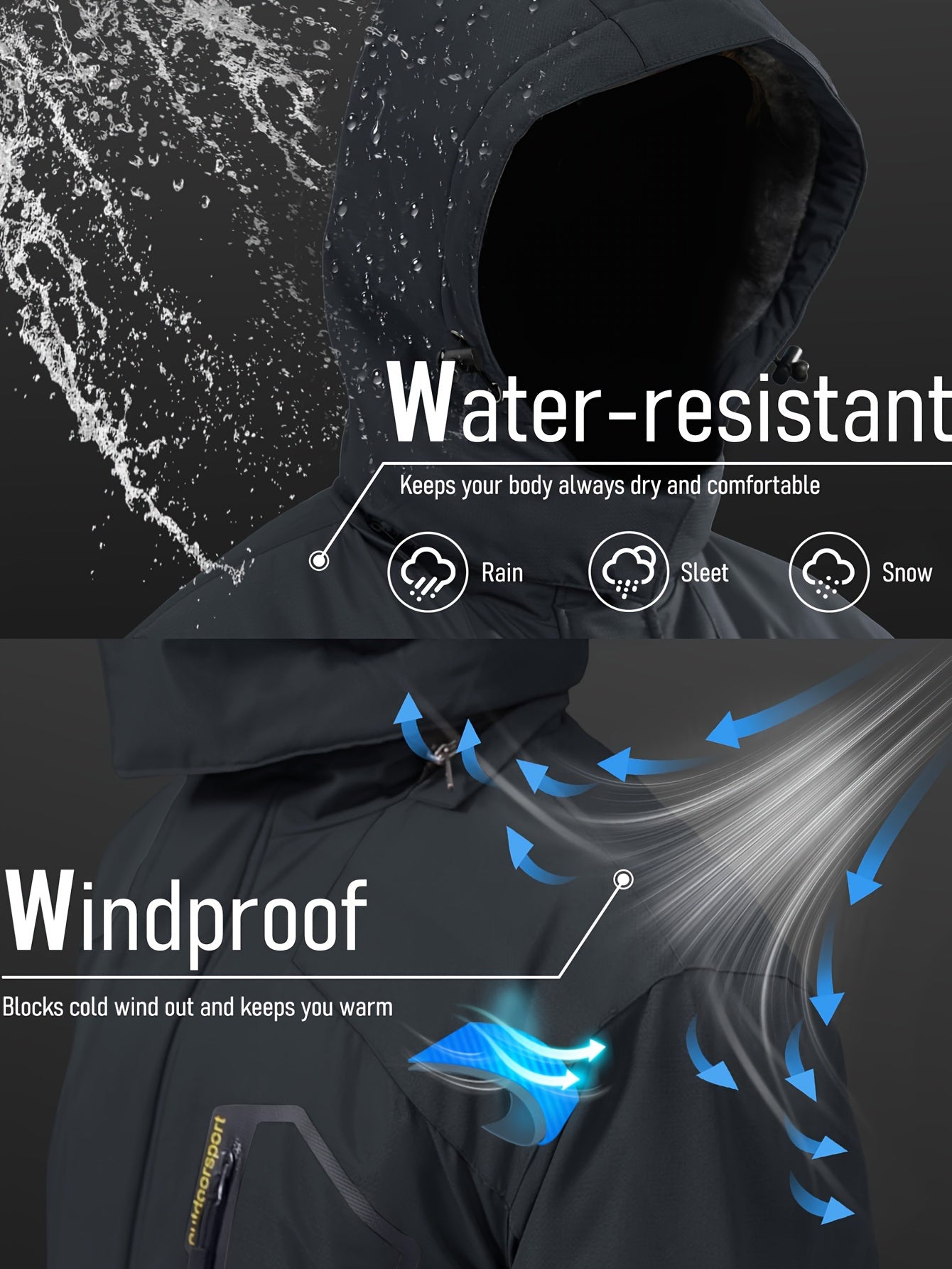 Men Winter Ski Snow Jacket - Multiple Zipper Pockets, Large Storage, Removable Hood, Adjustable Cuffs