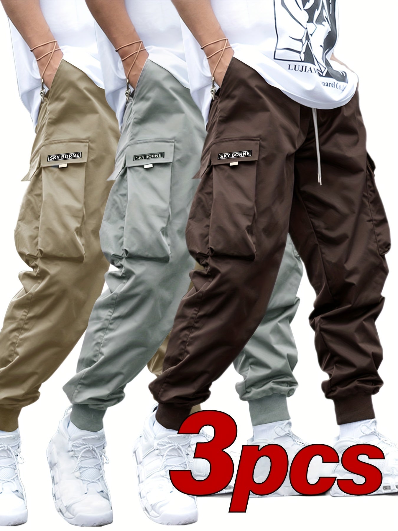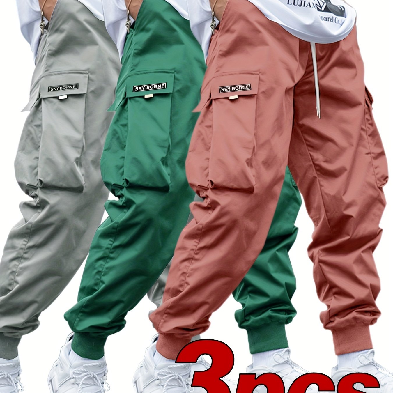 Men's Casual Letter Pattern Cargo Pants Set of 3, Mid-Rise Woven Fabric Trousers with Drawstring Waist, Belt Loops