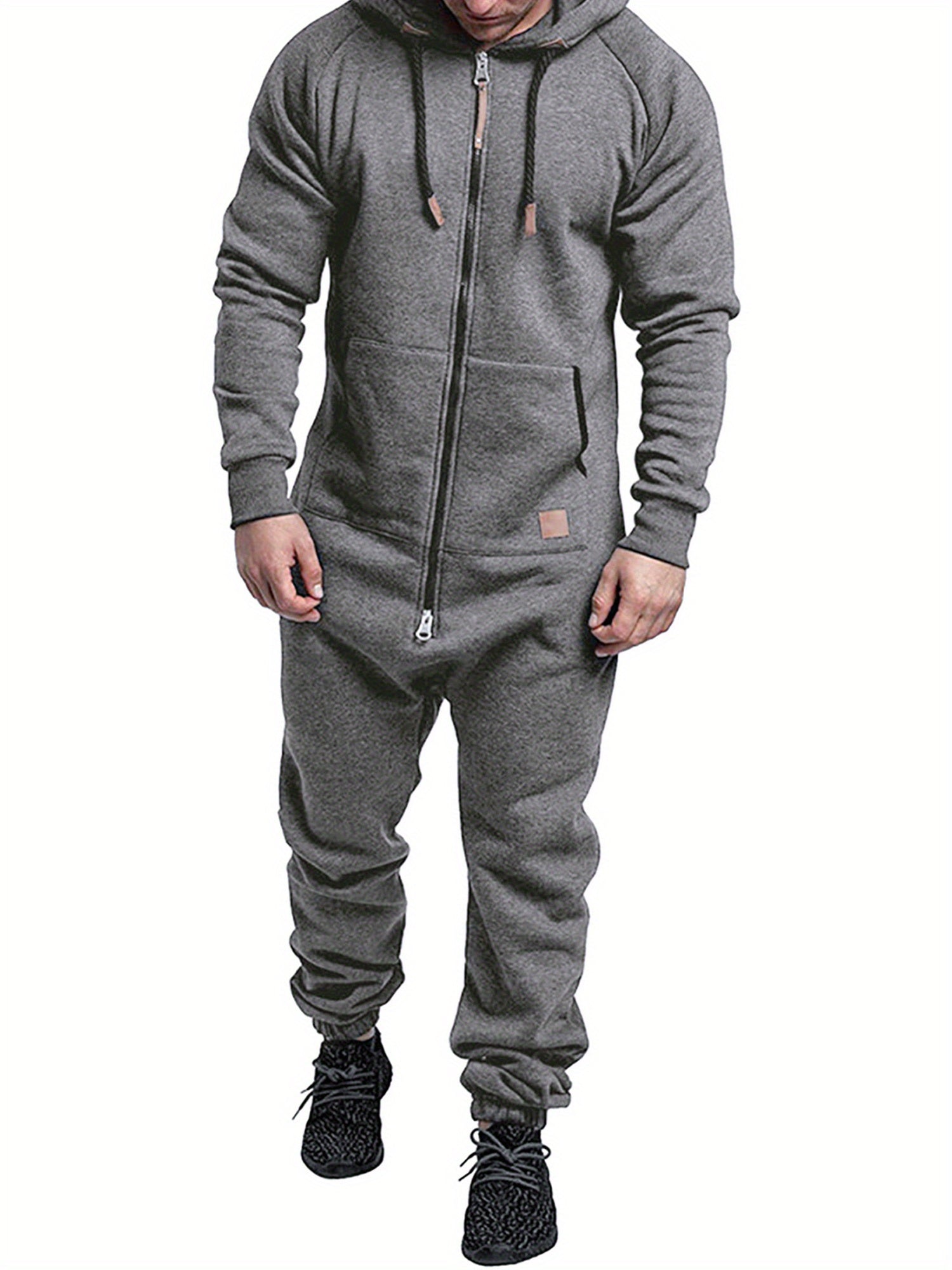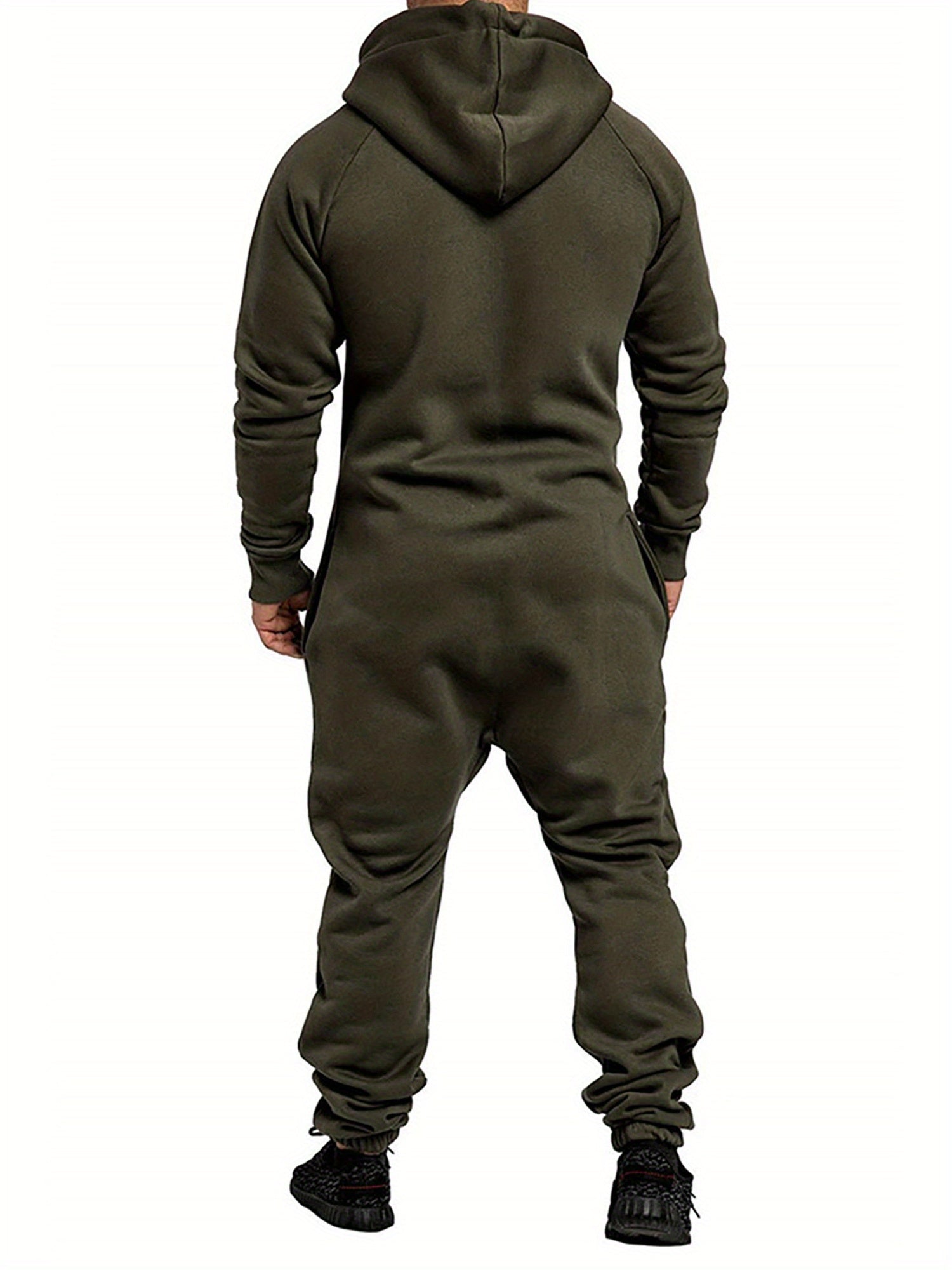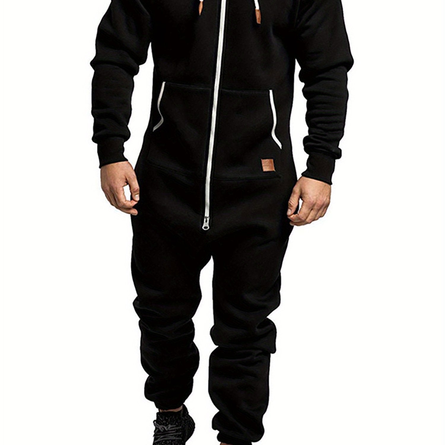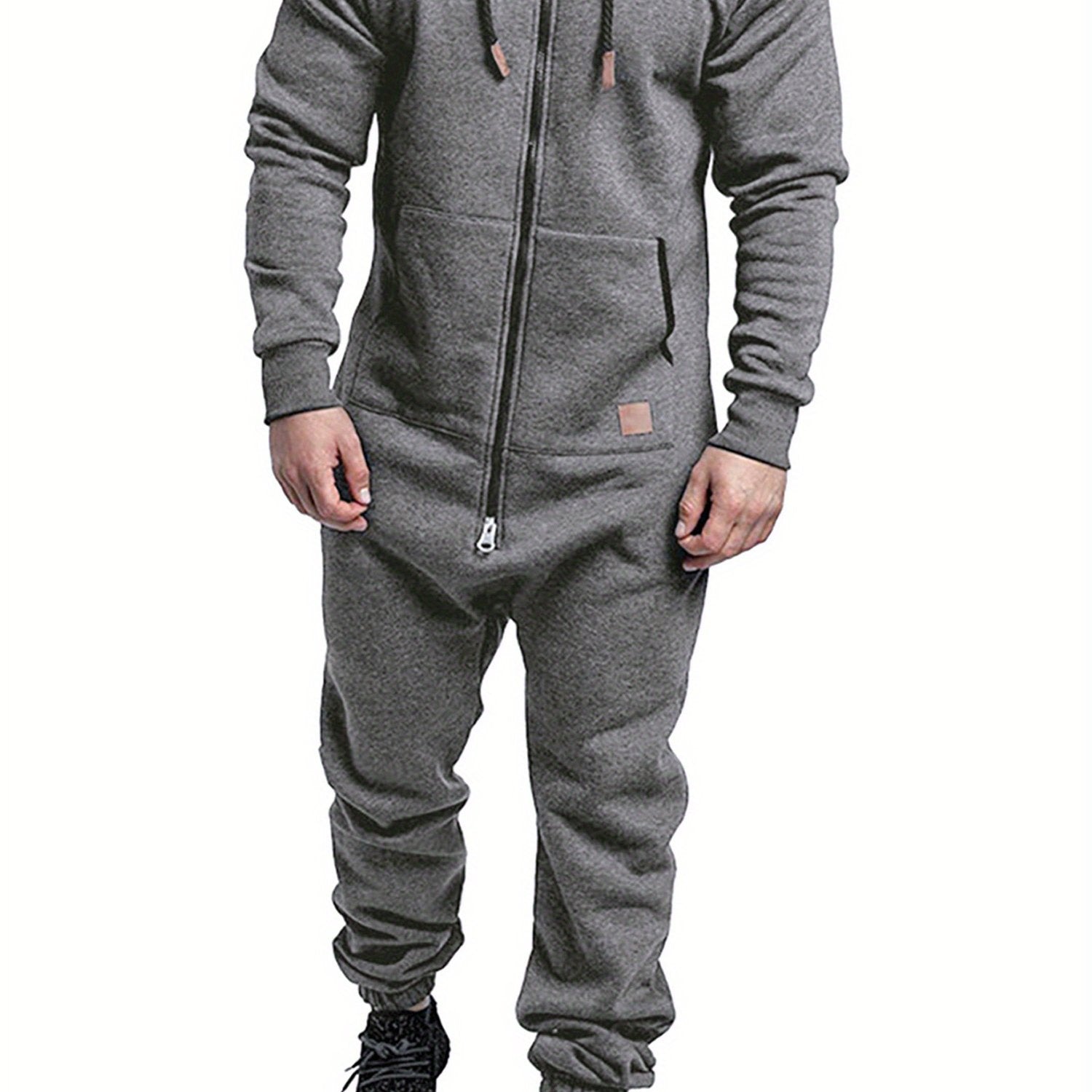 Men's Hooded Fleece Lining Jumpsuit, Long Sleeve Full Zipper Overalls with Kangaroo Pockets