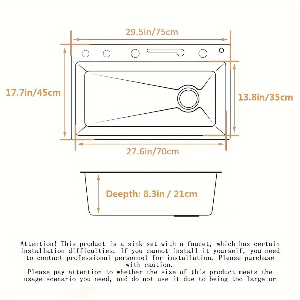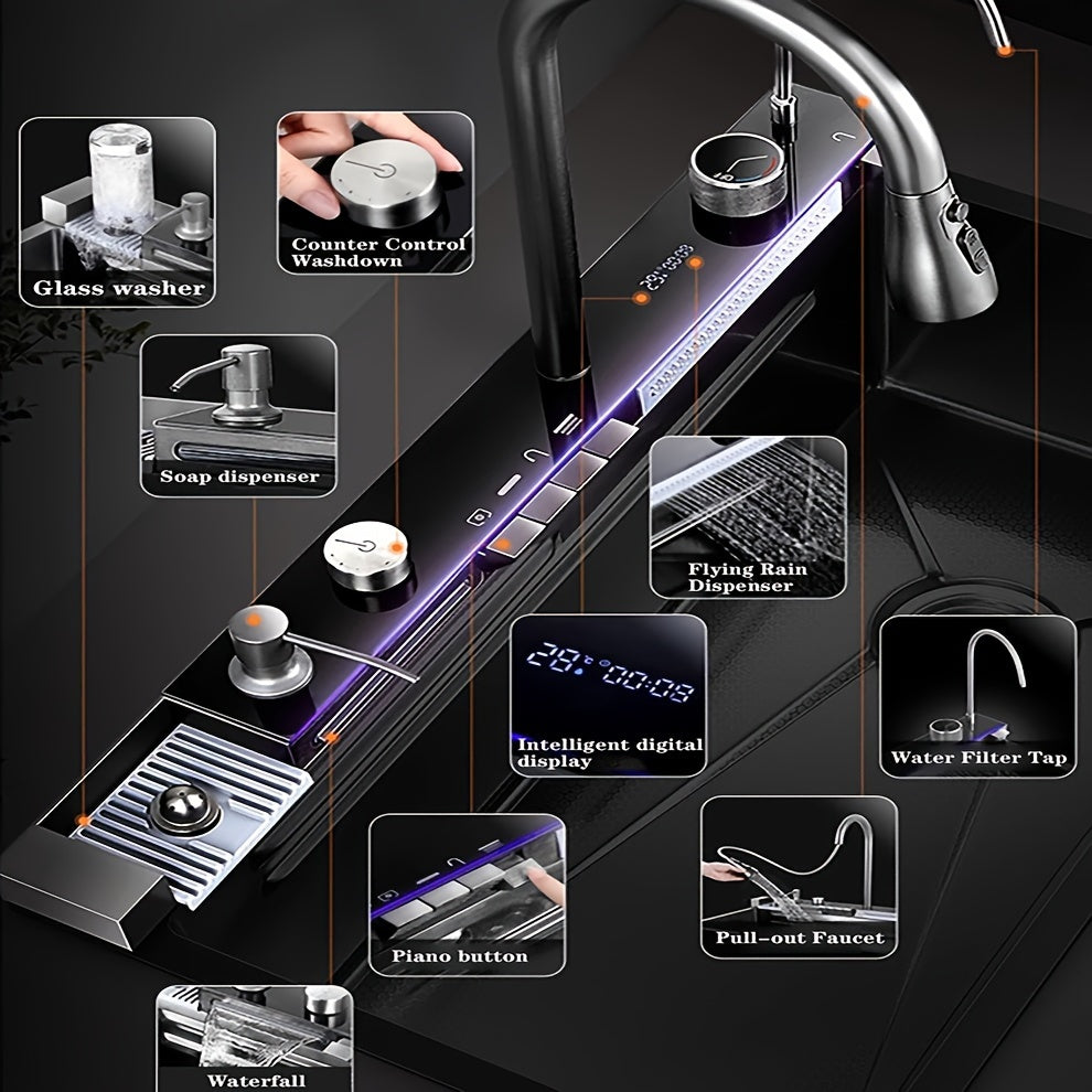 Multi-function Digital Display Waterfall Kitchen Sink, Black Stainless Steel Sink With Two Waterfalls And A Cup Washer