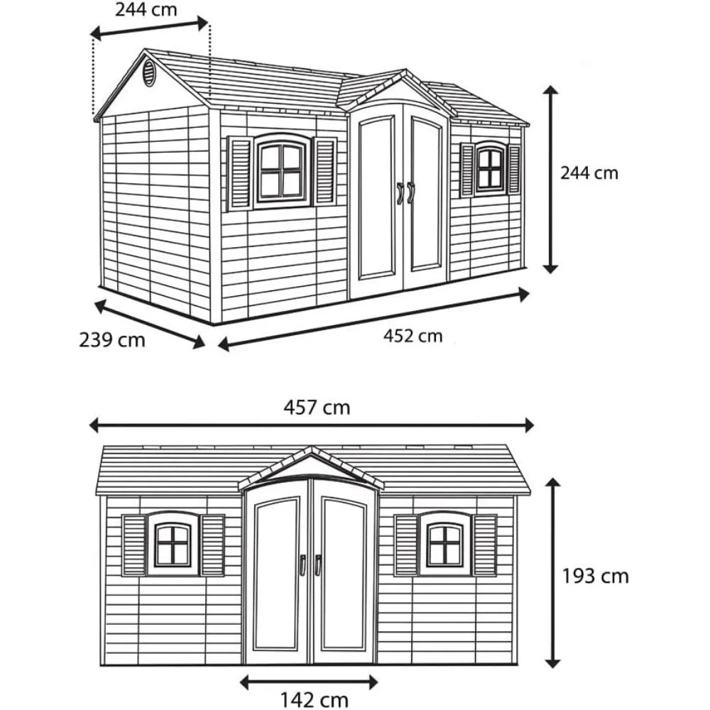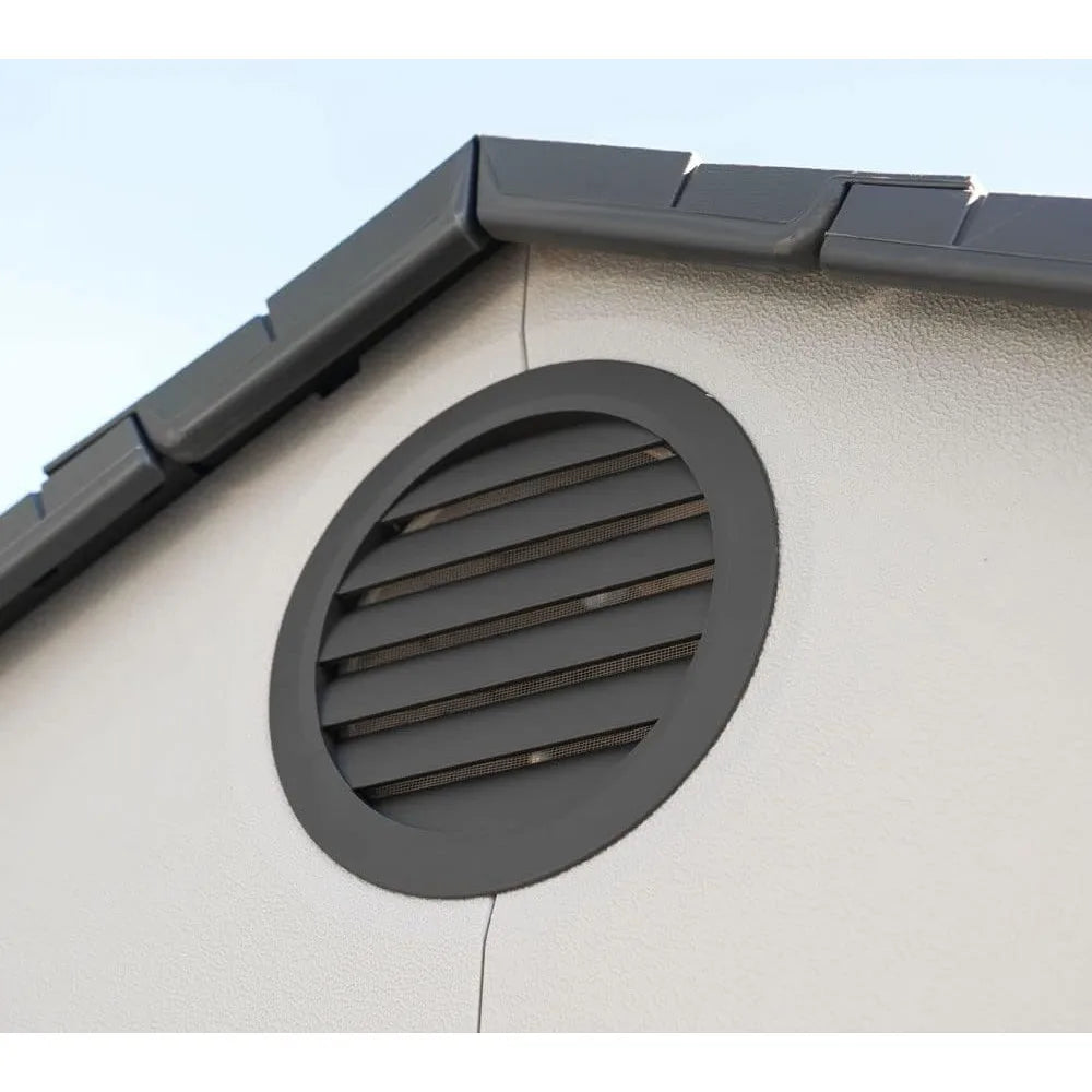 - Features- 6 small skylights, 2 shatterproof polycarbonate windows, 2 screened vents, 2 decorative shutters, 2 peg strips, 2 90" x 9" shelves, 4 corner shelves.