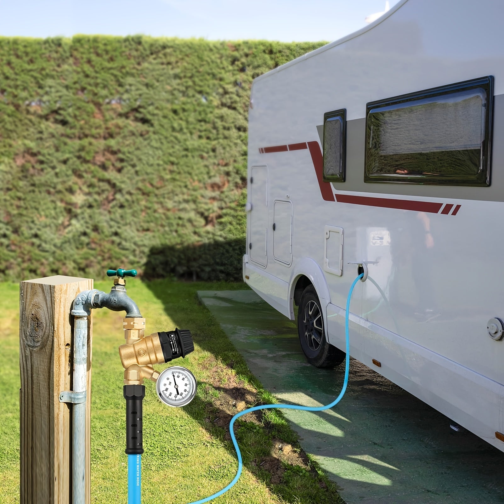 RV Water Pressure Regulator, Adjustable Handle Brass Lead-Free Reducer Valve, Water Pressure Regulator With Gauge And 2 Inlet Screened Filters