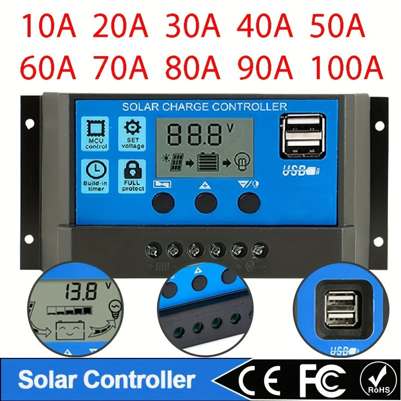Solar Charger Controller with LCD Display - 12V/24V, Dual USB 5V Outputs