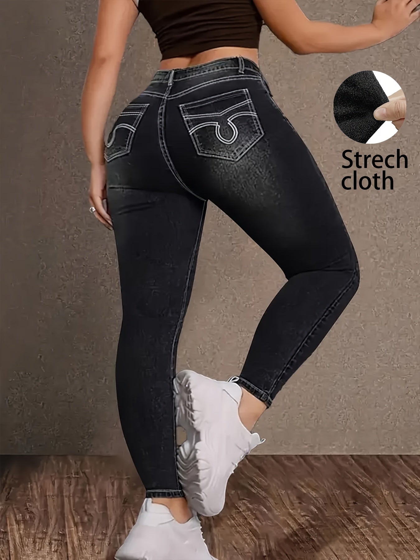 Vintage Black High-Waist Stretch Denim Jeans - Plus Size, Geometric Embroidery, Pockets, Rayon Blend