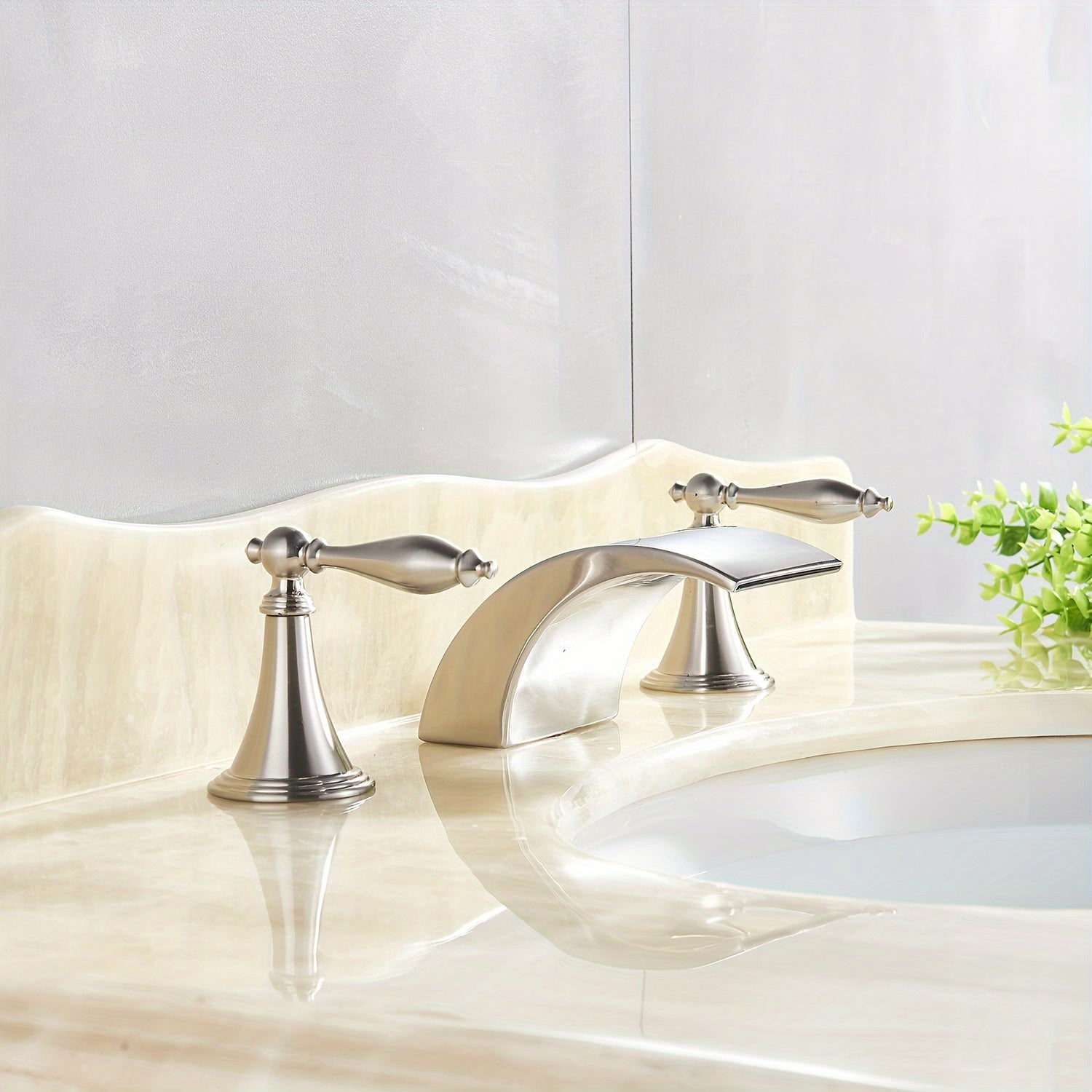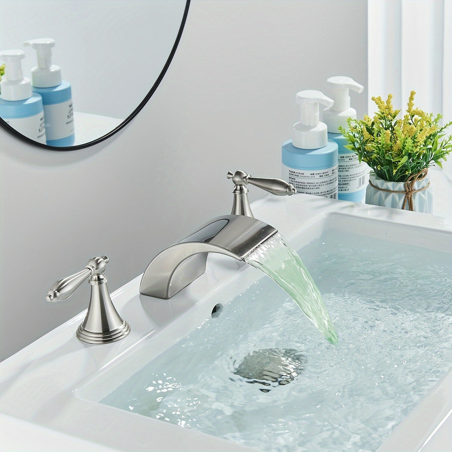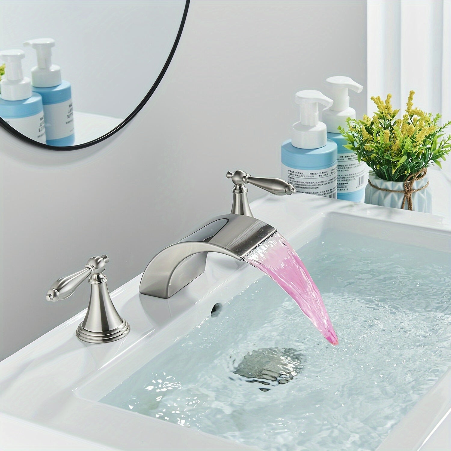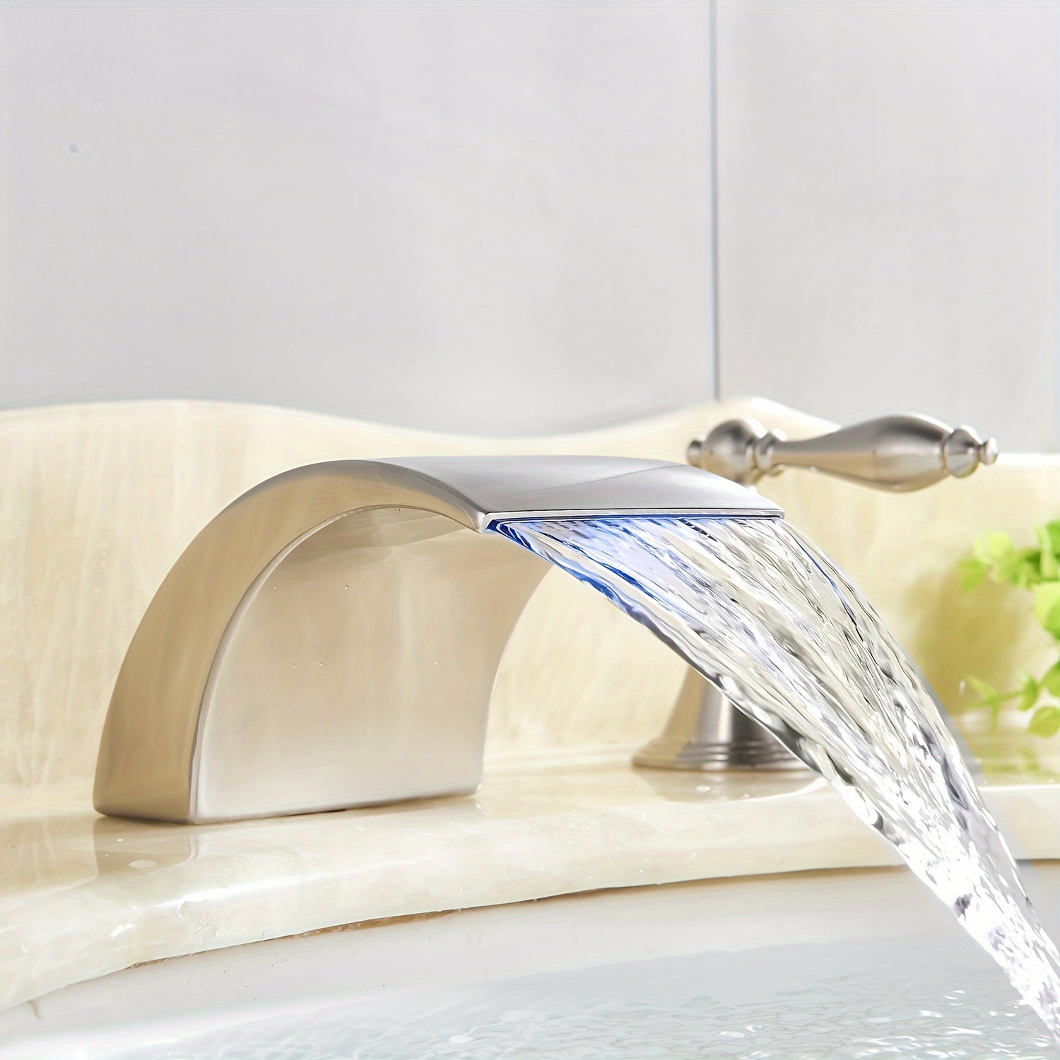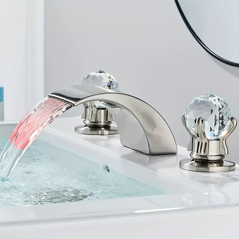 Waterfall Widespread Bathroom Sink Basin Faucet, 3 Hole 2 Handle With LED 8" Widespread LED Bathroom Sink Basin Fauce
