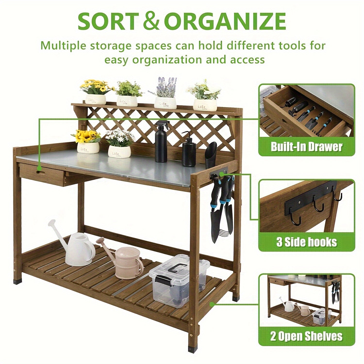 INTEGRATED STORAGE SOLUTIONS: Equipped with a cabinet drawer and 3 storage hooks, this bench offers specialized space for hand tools, additives, and other gardening essentials.